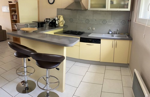 -Large living room of 50m² with kitchen (dishwasher, mini oven, microwave, 4 gas hobs, fridge / freezer, coffee maker Dolce Gusto, toaster, kettle, steamer, robot pastry)